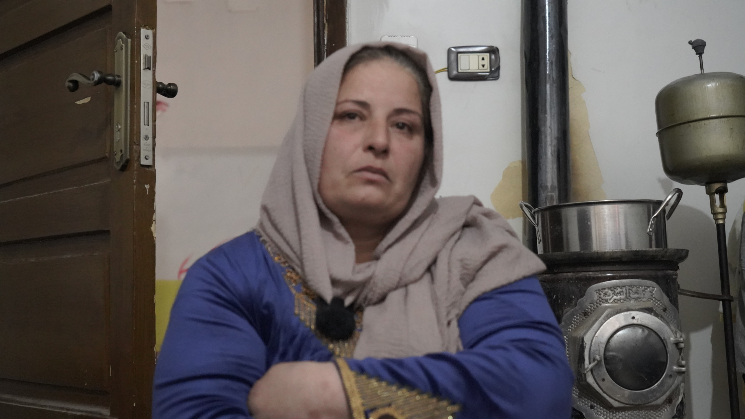 In einer Schule, in der hunderte kurdische Familien untergebracht sind, besuchen wir die Familie Abdullah, die ursprünglich aus Efrîn stammt. Mit einem Ölofen, den sie von der Bevölkerung erhalten haben, leben fünf Personen in einem etwa 10 Quadratmeter großen Klassenzimmer. Die 44-jährige Zeynep Valid Abdullah ist seit Februar 2018 auf der Flucht und kam erst vor einer Woche hier an. Vor dem Angriff der Türkei auf Efrîn führte die Familie ein friedliches Leben; in den letzten acht Jahren wurden sie quer durch Syrien getrieben. Ihr jüngstes Kind brachte Zeynep während der Flucht zur Welt. Die Erschöpfung steht ihr ins Gesicht geschrieben.